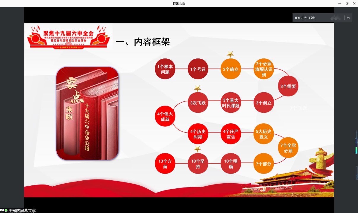博士生王媛同学进行导读。内容共分为三大部分进行阐释分析。第一部分,内容框架。以数字为线索清晰的列出了整个决议的总体内容,分别是1个根本问题、1个号召、2个确立、2个必须清醒认识到、3个需要、3个创立、3个重大时代课题、4个历史时期、4个伟大成就、4个庄严宣告、5大历史意义、7个全党必须、7个部分、10个明确、10个坚持、13个方面。第二部分,专题分析。专题一:“两个确立”的重要意义。“两个确立”是马克思主义的内在属性、“两个确立”是中国共产党的宝贵经验、巩固党的十八大以来取得的伟大成就、新时代党和国家事业发展、推进中华民族伟大复兴历史进程的现实需要、彰显了人民性、历史性和时代性的高度统一。专题二:马克思主义中国化的“第三次”飞跃。习近平新时代中国特色社会主义思想是当代中国马克思主义、二十一世纪马克思主义,是中华文化和中国精神的时代精华,实现了马克思主义中国化新的飞跃。专题三:十个坚持”的科学内涵与逻辑关系。为什么要提“坚持”?“坚持”既是底线思维的体现,也象征着战略定力,就是要绵绵发力、久久为功。为什么要提“十个坚持”?是因为这十个方面是具有根本性和长远指导意义的十条历史经验。第三部分,学习心得。在学习过程中要一字一句学、结合起来学、带着信仰学、带着问题学,也为今后同学们深入学习带来思考。