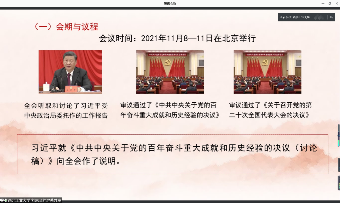 在历时两个半小时的读书会中,同学们踊跃与两位老师交流读书心得,探讨相关问题,张帆教授就“十九届六中全会的公报和决议的区别与联系”这一问题做出了详细解答。十九届六中全会公报的内容更多的是对大会总体内容的介绍,而决议是对党的百年历史决议内容的总结概括,两者的对象有很大区别。同时对习近平新时代中国特色社会主义思想的未来发展做了一种观点的阐释,认为习近平新时代中国特色社会主义思想在理论主题、理论范围和话语表达上需要明显的区分,现在还没有完全成熟,这不仅是一个学术问题,更是一个政治问题,还有待继续观察。