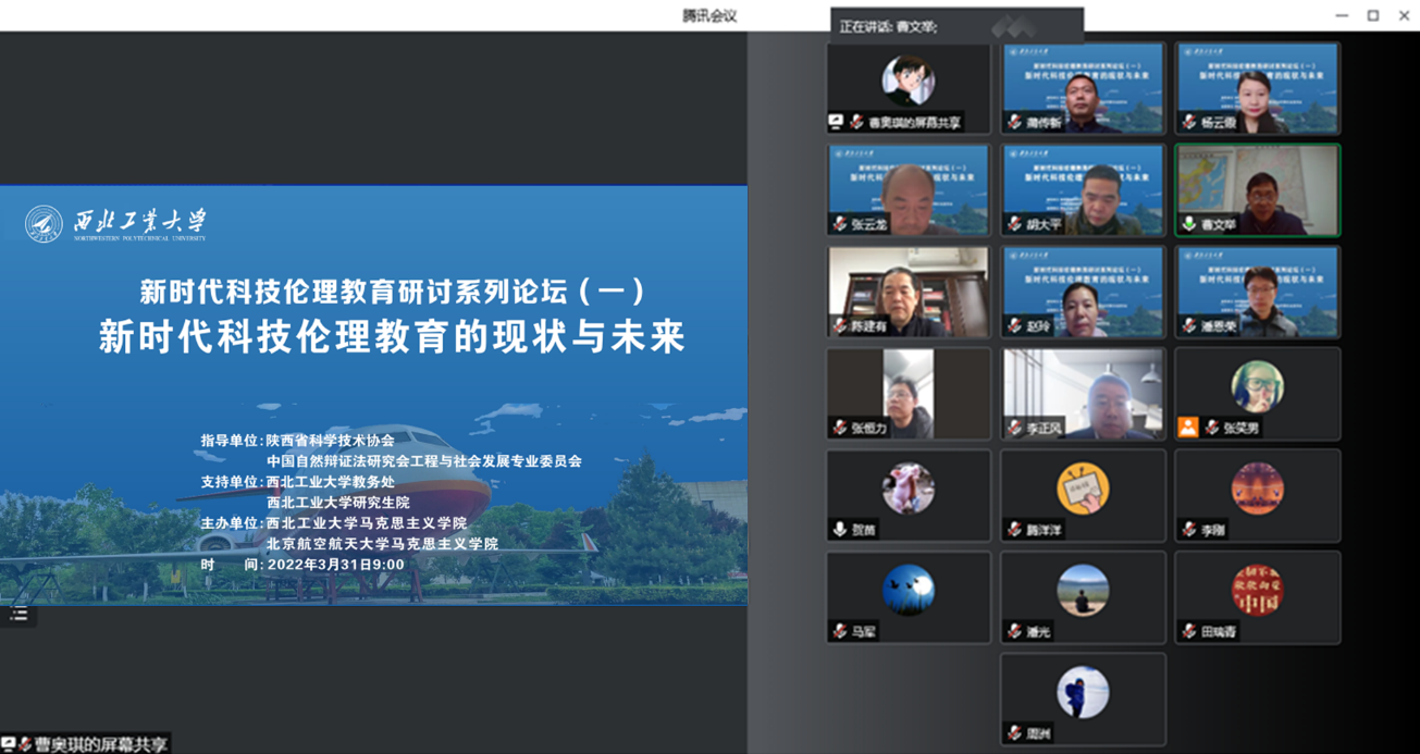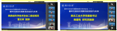 共同主办,受到了陕西省科学技术协会,中国自然辩证法研究会工程与社会发展专业委员会,西北工业大学教务处、研究生院等多方指导支持。陕西省科协二级巡视员曹文举、西北工业大学党委副书记陈建有出席论坛并致辞,与会专家学者围绕“新时代科技伦理教育的现状与未来”这一研讨主题进行相关主题报告,来自各高校、科研院所与师生300余人参加此次线上会议。本次会议由澳门威尼斯人官网