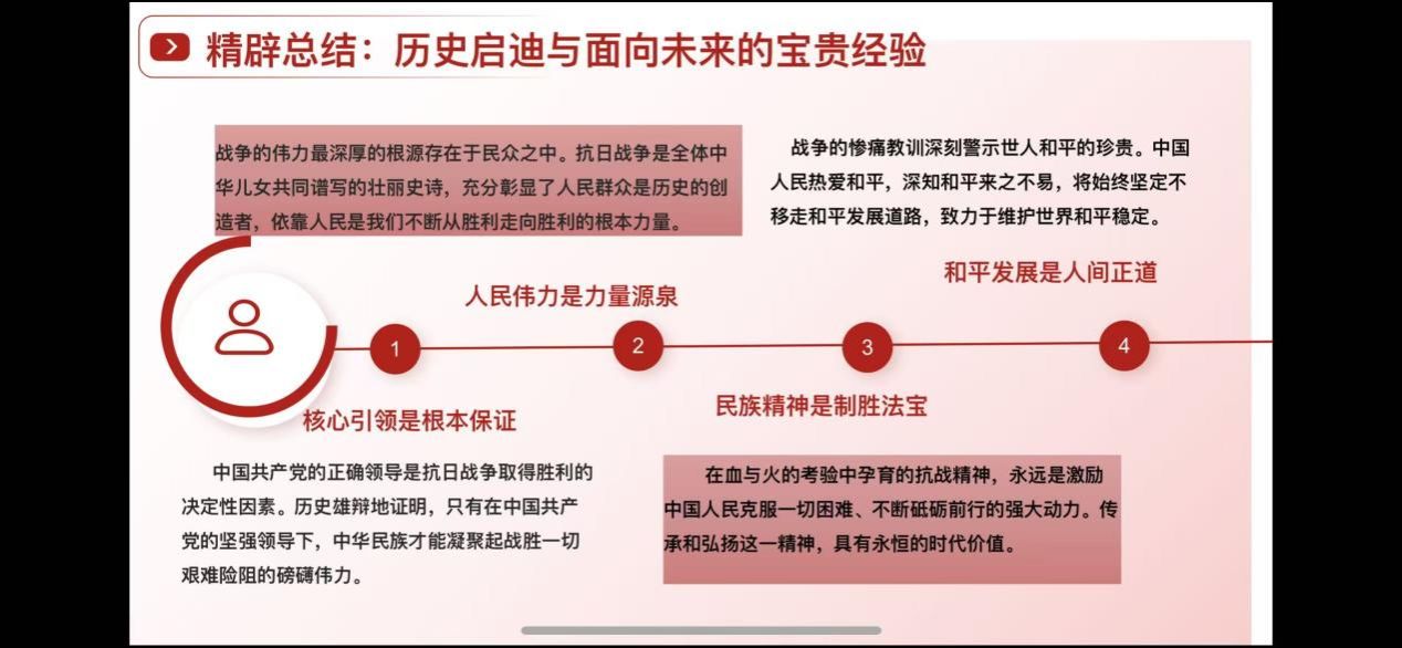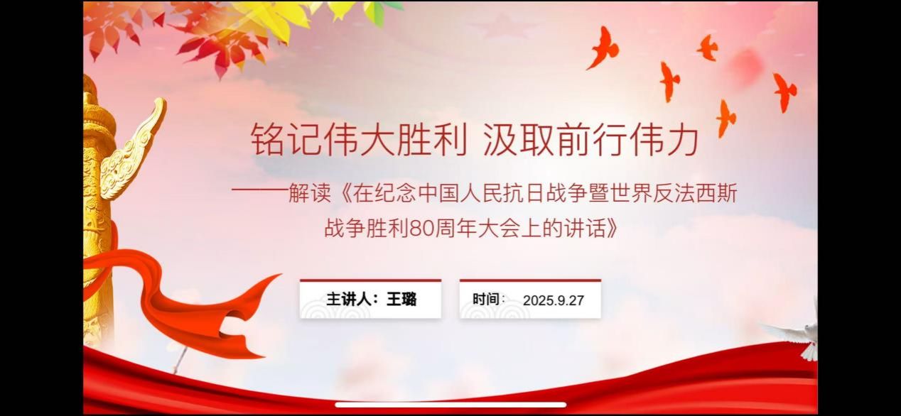 博士生王璐同学以《铭记伟大胜利 汲取前行伟力》为题,从深刻昭示东方主战场与世界正义的胜利丰碑;深情礼赞民族脊梁与不朽精神的光辉史诗;精辟总结历史启迪与面向未来的宝贵经验;时代召唤铭记历史、共创未来的庄严宣言,四个板块对讲话内容进行了深入浅出地解读。她认为《习近平在纪念中国人民抗日战争暨世界反法西斯战争胜利80周年大会上的讲话》深刻阐释了抗战胜利的伟大意义,深情礼赞了中华民族的英勇抗争,精辟总结了历史经验,并向世界发出了维护和平、共创未来的时代强音。