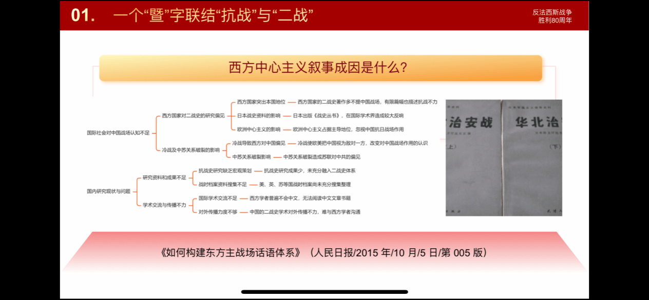 博士生韩藤阁同学,在认真研读《习近平在纪念中国人民抗日战争暨世界反法西斯战争胜利80周年大会上的讲话》的基础上,从一个“暨”字联结“抗战”与“二战”,两个“是”字构筑中国的二战叙事,三个“还是”在人类命运的十字路口发出时代之问,四重逻辑维度:历史叙事、精神传承、中国力量与人类文明,四方面对讲话进行了深入的解读。他认为中国人民抗日战争与世界反法西斯战争不容割裂,“话语权”是胜利的成果之一;中华民族应用抗争的民族视角促进深化民族记忆,凝聚共识。