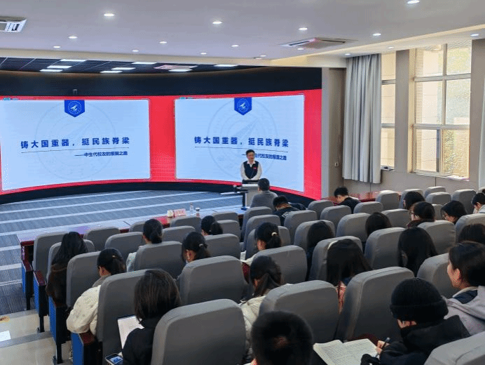 王宇波以“为谁培养人、培养什么人、怎样培养人”的教育根本问题为开篇,从“古路坝灯火”救国初心切入,深情讲述师昌绪、陈士橹等老一代前辈“科技救国”的伟大壮举;精准聚焦唐长红、陈勇等中生代校友铸大国重器的使命担当;细致讲解尹东、唐勇等新生代校友的强国实践。他通过“一个甲子的坚守”“史上最牛航空班”等一个个感人故事与动人细节深度解读人才培养的“西工大现象”,生动地为同学们展现了我校在不同时期为党育人、为国育才的深刻实践,勾勒出西工大人才培养传承图谱。他勉励同学们要将学校“公诚勇毅”“三实一新”的校训校风融入自己的成长生涯,结合澳门威尼斯人官网