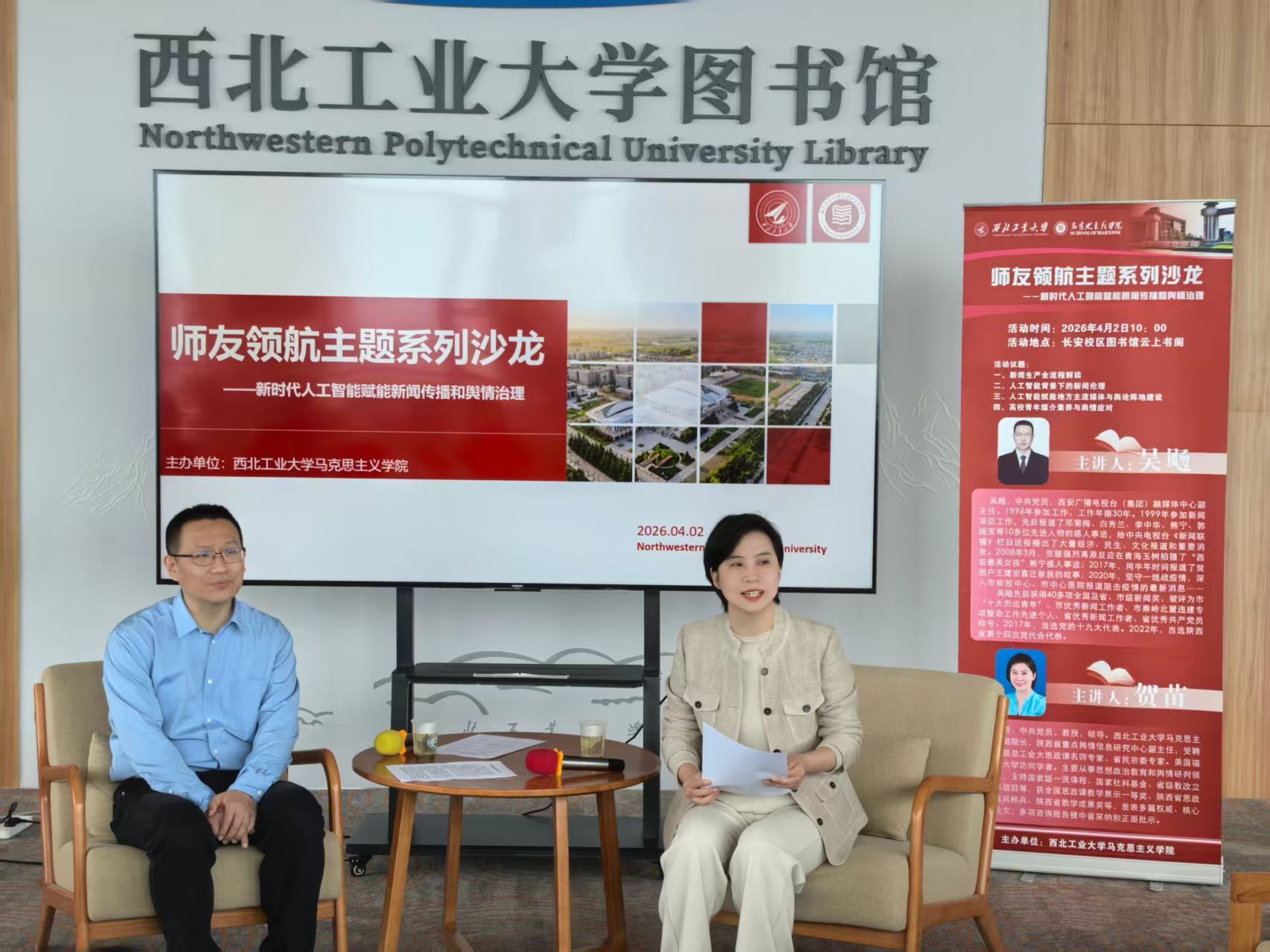 持续深化师生交流,助力学子成长,推进“大思政课”立德树人实效,创新开展师友领航主题系列沙龙。4月2日,特邀西安广播电视台(集团)融媒体中心副主任吴飏,聚焦融媒时代新闻宣传工作发展与舆情生态变革,为师生带来前沿分享与深度探讨。本次沙龙在长安校区云上书阁进行,澳门威尼斯人官网